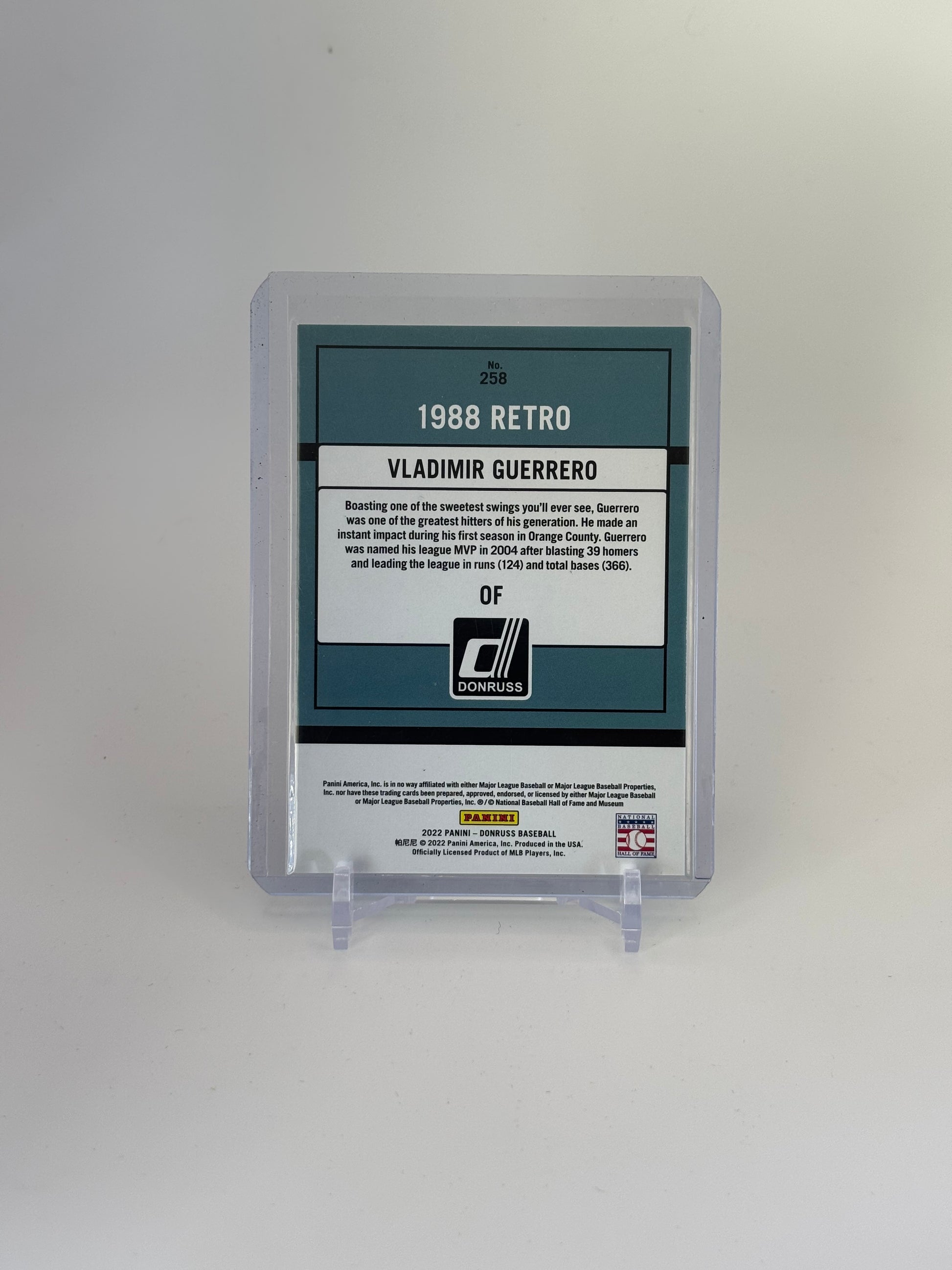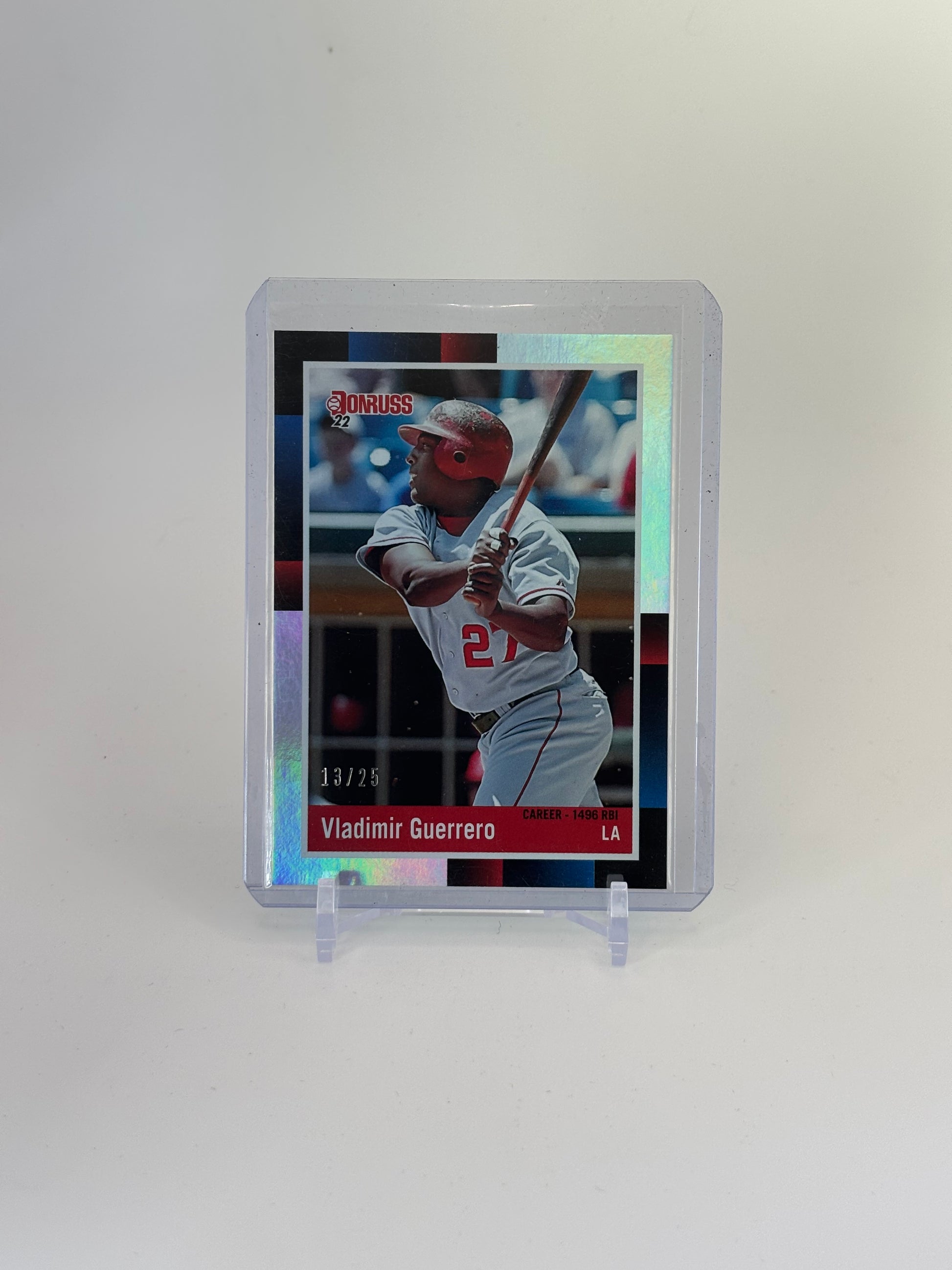 Vladimir Guerrero Sr.’s 2022 Donruss Retro 1988 Voltage #13/25 card pays tribute to one of baseball’s most electrifying hitters. Guerrero’s Hall of Fame career spanned 16 MLB seasons, highlighted by a .318 batting average, over 2,590 hits, and 449 home runs. Renowned for his exceptional bat speed, strong arm, and ability to hit pitches outside the strike zone, he earned 9 All-Star selections and the 2004 AL MVP award. This limited-edition card captures the essence of Guerrero’s dynamic style and cements his legacy as one of the game’s all-time greats.